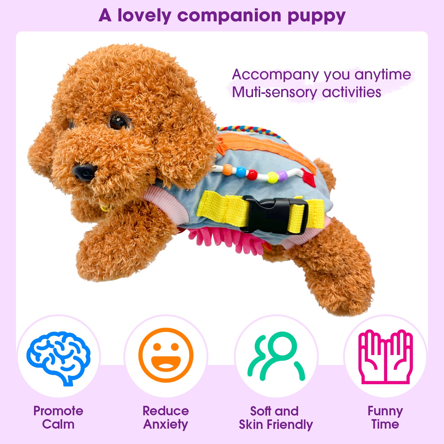 Sensory dog blanket has various elements including yellow zipper, telephone cord that can be pulled, colored straps, colored beads that can be rubbed, and straps with release buttons.A sequin area is also added, which is suitable for people with weak visual nerves. So many accessories can exercise fingers, stimulate nerves, and relieve anxiety