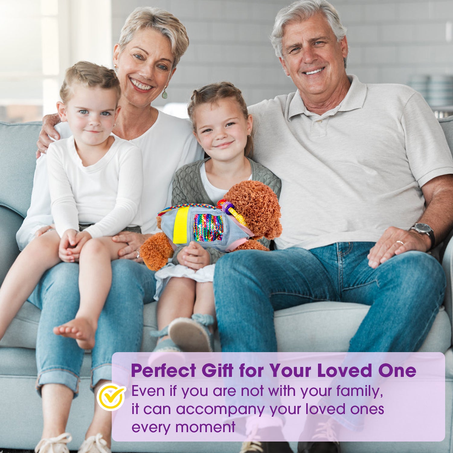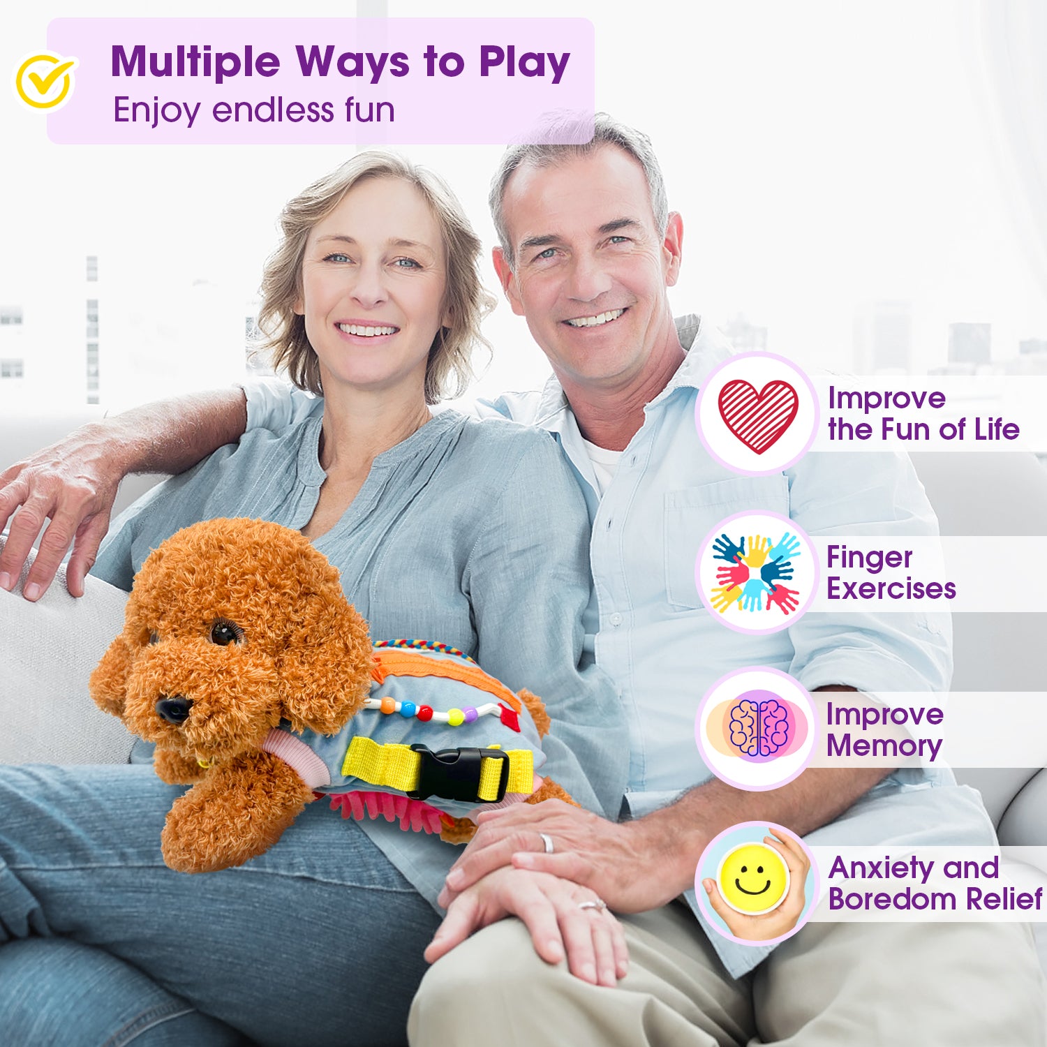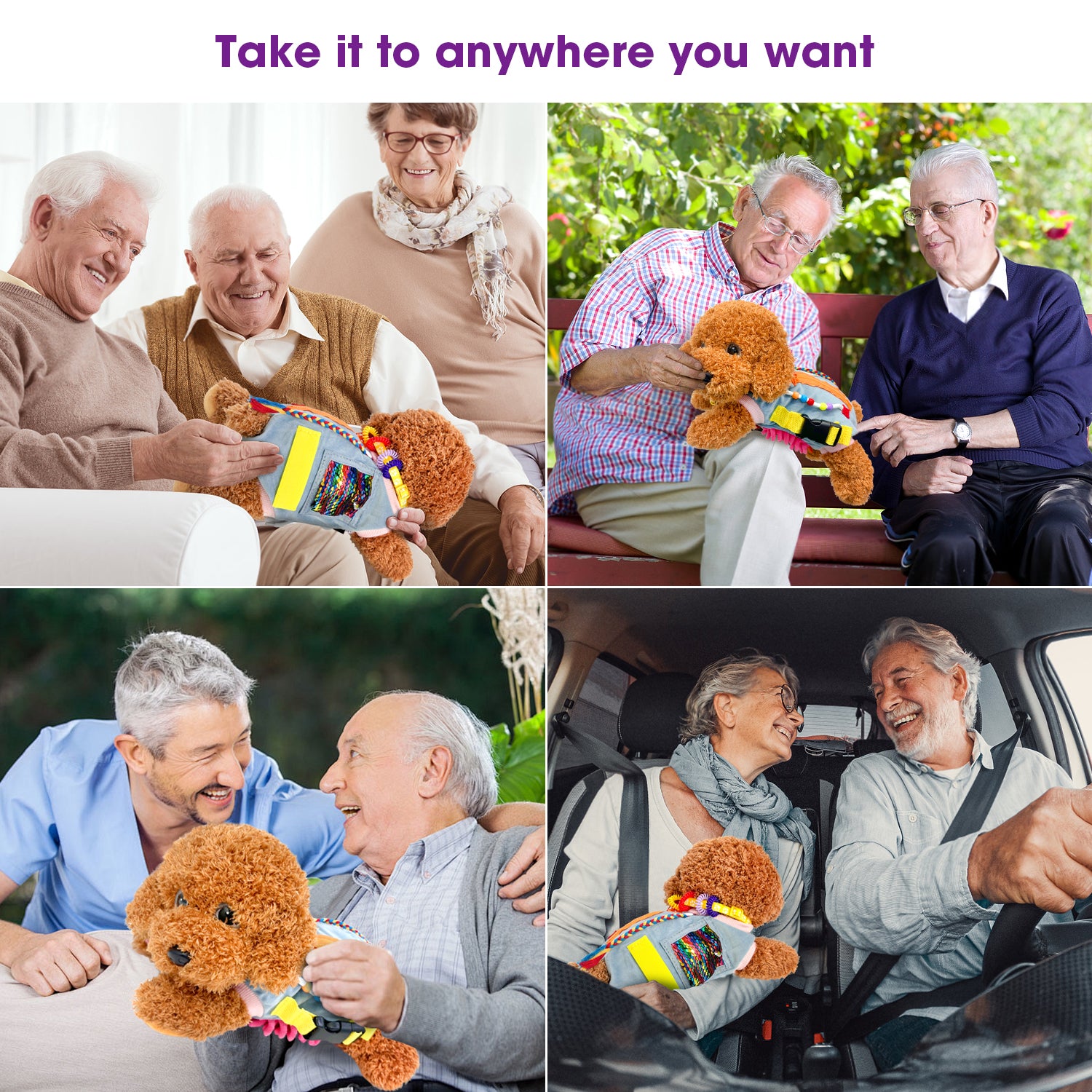 Our fidget dog blanket is specially designed for people with dementia, Alzheimer's , memory loss and anxiety. Through a variety of elements, it keeps hands busy and relieves boredom and anxiety. The bright colors achieve visual impact, and the crisp bell sound forms a triple stimulation of "visual-touch-auditory"