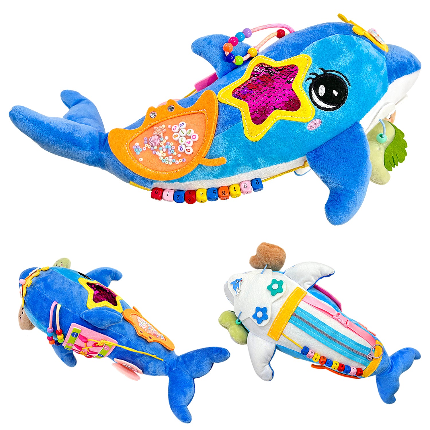 - Montessori Sensory Toy: This sensory stuffed dolphin will provide emotional support and a sense of security for your child at all times! Manta ray with numbers, Rope-threading training, Stars with reversible sequins, Colorful numbers, Zipper and so on. Too many fun playing things on this busy bord for your kids.