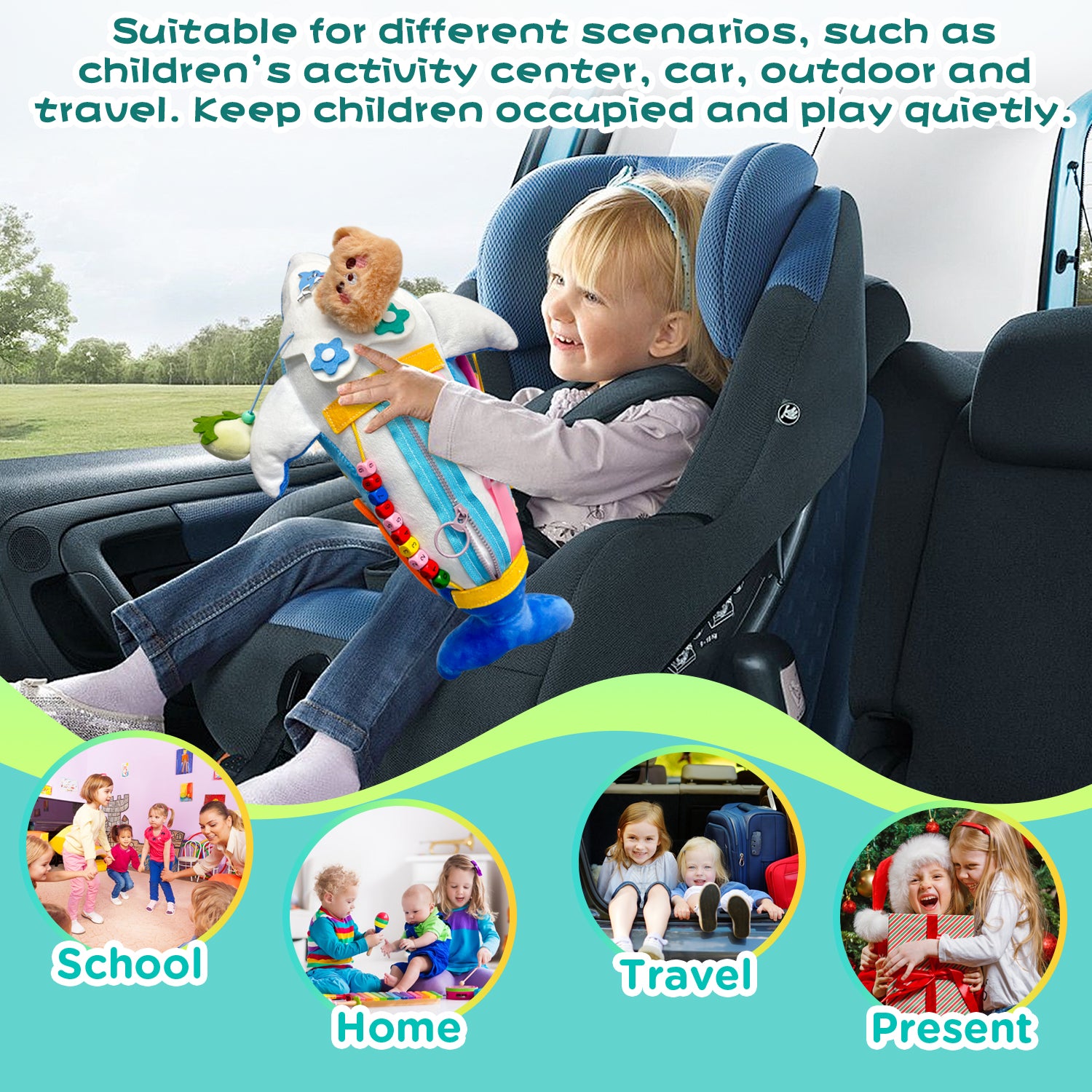 Montessori Toys for Babies, Sensory Busy Board for Kids at Age 3+, Travel Toys with Educational Activities for Learning Fine Motor Skills, Soft Stuffed Animal Gift for Boys Girls