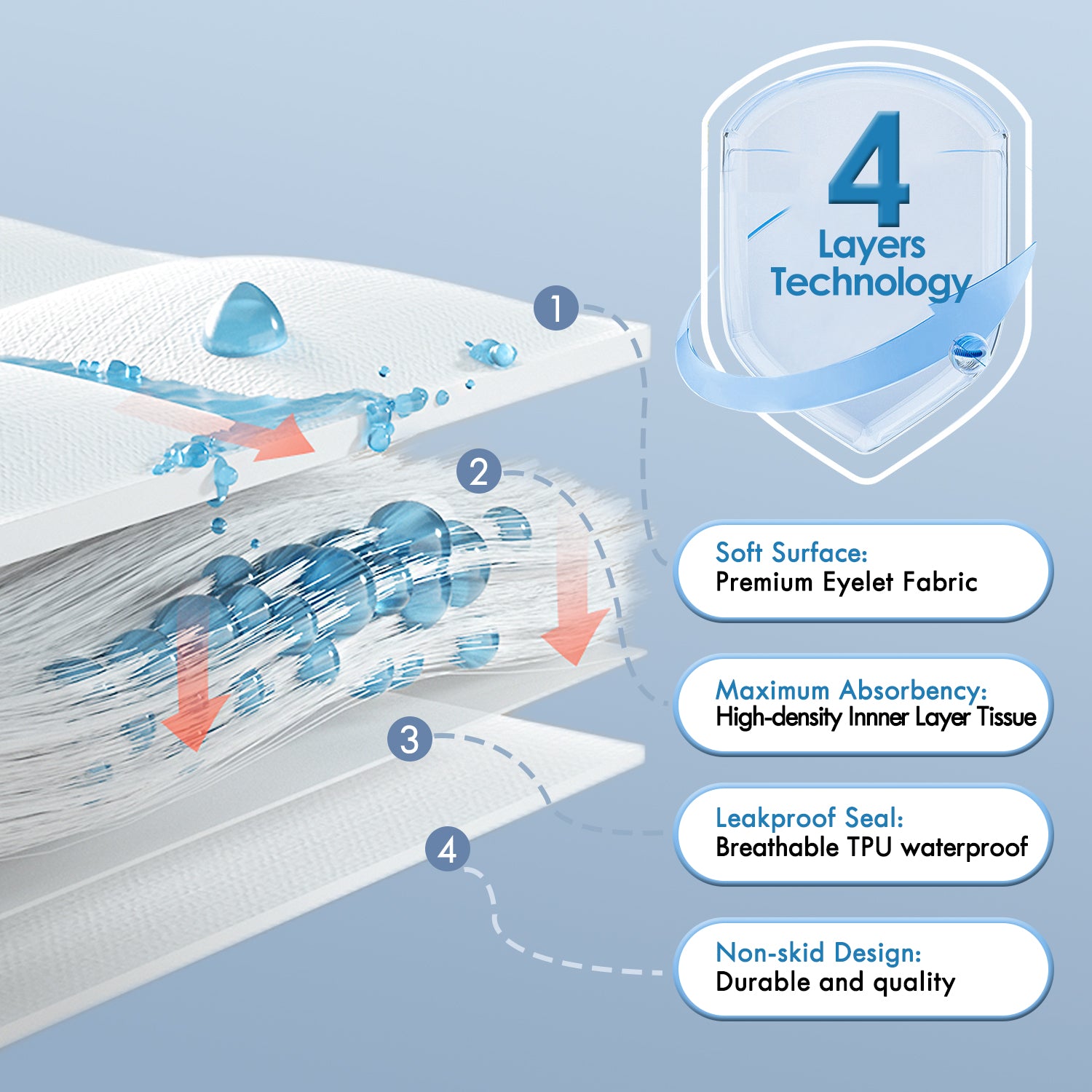 - 3. FOUR-LAYER DESIGN: Our Incontinence bed pads feature a unique 4-layer design: The first layer of premium eyelet fabric with a soft cotton top surface. The second layer is a high-density inner layer, super absorbent liner, and vinyl. The third layer is breathable and waterproof, keeping your sheets dry. The last layer is non-skid plastic drop fabric, protecting all night while being comfortable and discreet.