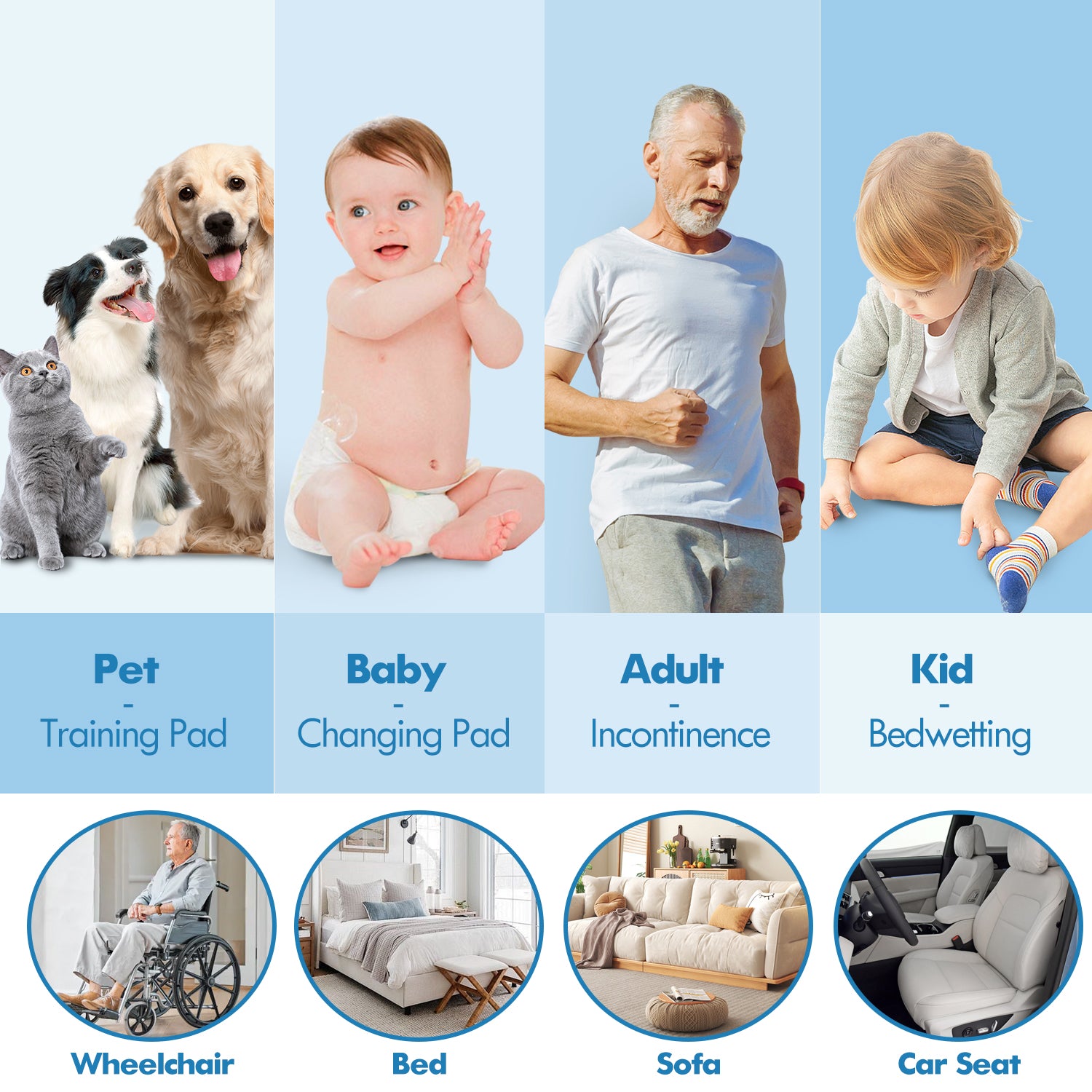 - 6. VERSATILE AND REUSABLE: Our washable pee pads can be used as training pads for dogs, changing pee pads for babies, and incontinence bedwetting mats for the elderly. In addition, it can be used as a mattress sheet cover as well as used in the bassinet, sofa, wheelchair, car seat, and cradle.